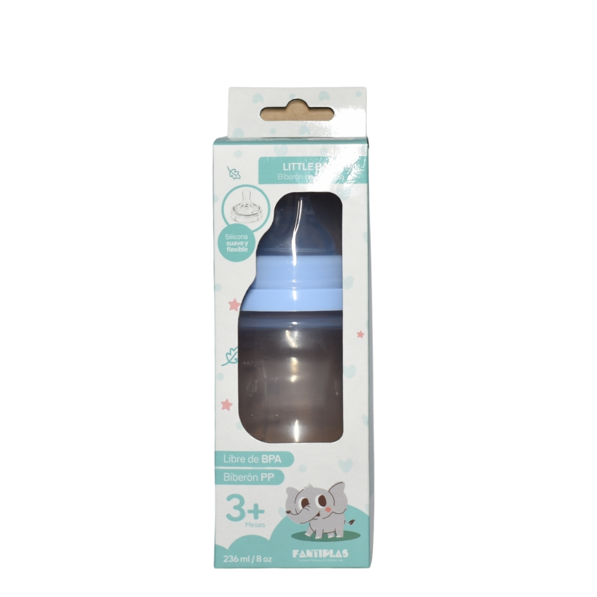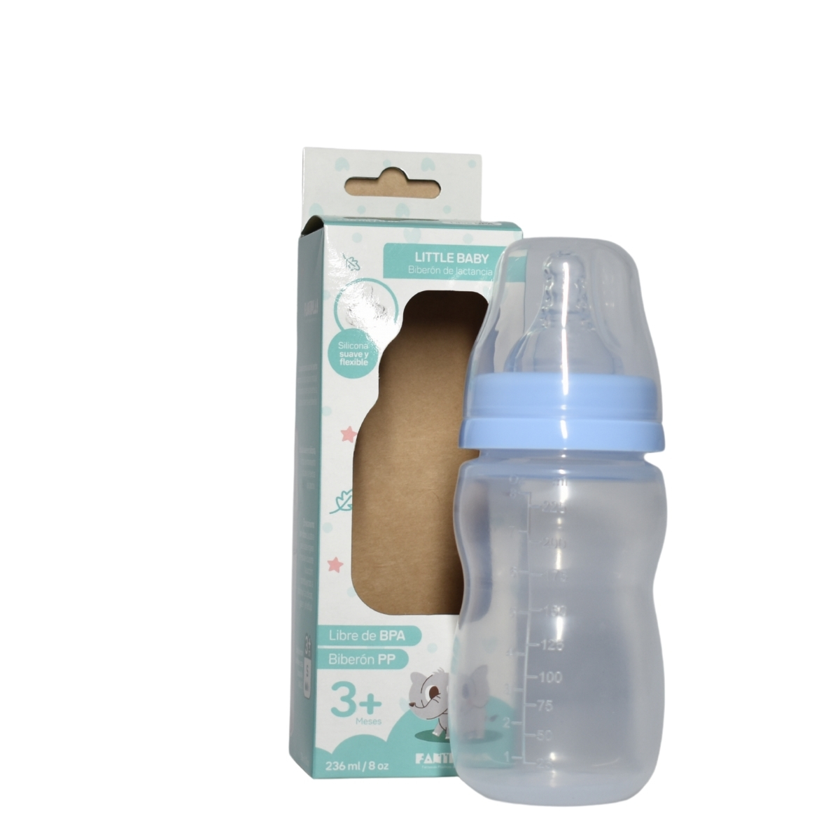 Biberón para bebé 8 oz (≈236 ml), fabricado en PP libre de BPA. Botella ligera con marcas de medición y tetina suave para una alimentación cómoda. Incluye capucha protectora para mantener la tetina limpia. Ideal para uso diario en casa o para llevar en el bolso del bebé.