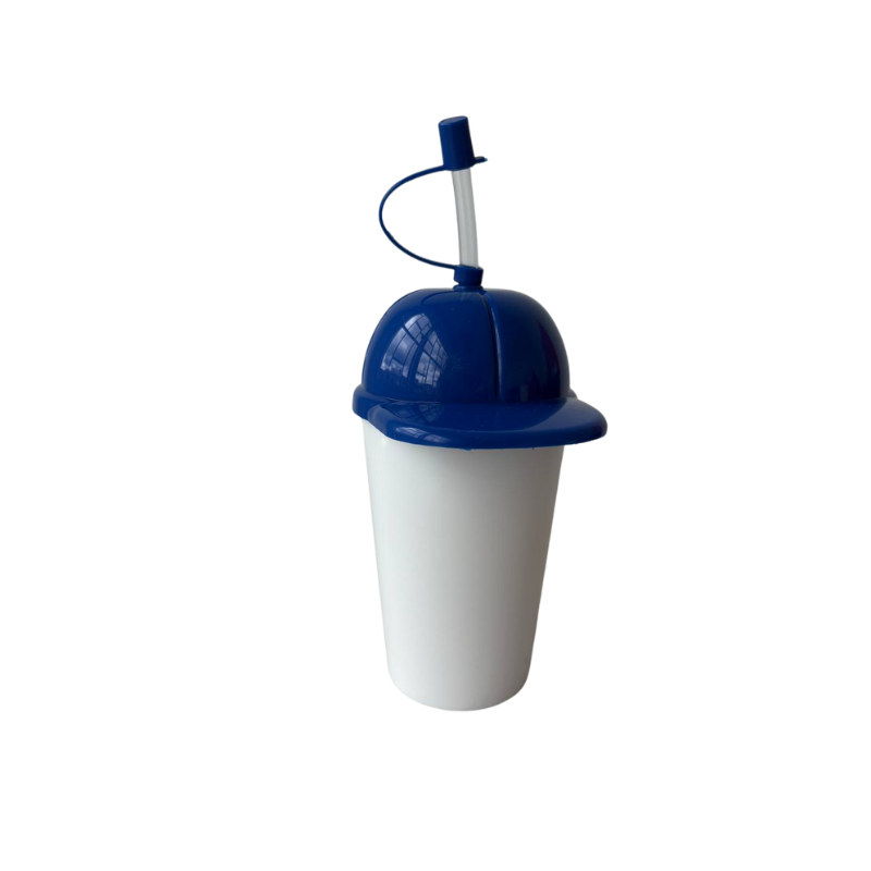 Vaso con tapa en forma de “cachucha” y pitillo reutilizable, perfecto para niños, eventos deportivos y campañas promocionales. Su cuerpo ligero y resistente facilita el agarre, mientras que la tapa tipo gorra evita derrames y protege el pitillo cuando no está en uso. Ideal para personalizar con estampados o branding.